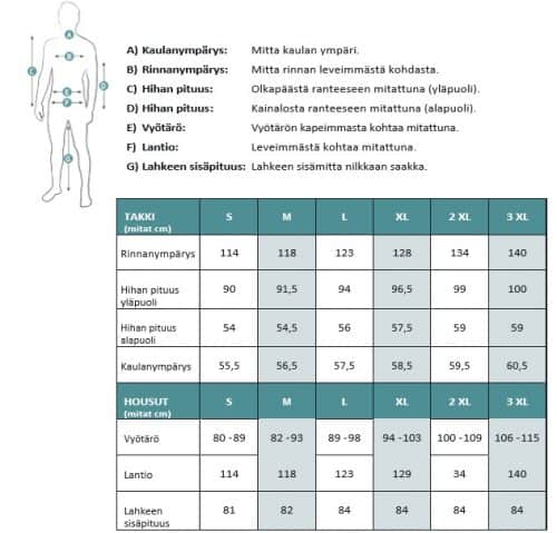 L housut, XL housut, XXL housut, L takki, XL takki, XXL takki