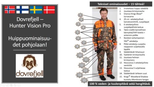 Dovrefjell Hunter Vision Pro on mukavan miellyttävä jahtikumppani säällä kuin säällä. Kangas on mukavan pehmeä mutta kuitenkin kestävää ja kevyt päällä. Puku ei kahise ja on hiljainen, näin jahti onnistuu paremmin.