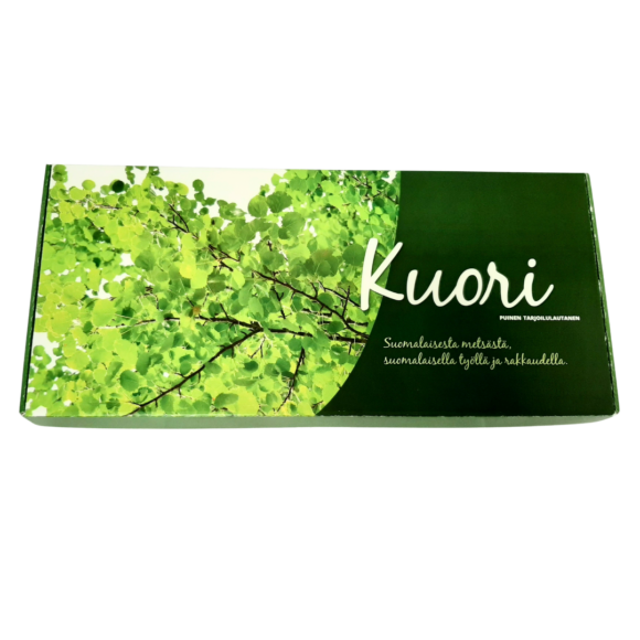 Kuori-lautanen tukee suomalaista uniikkia käsityöosaamista ja suomalaista yrittäjyyttä. Lautasen kupera muoto on saatu aikaan puun kuivatusprosessin lopputuotteena. Elintarvikekäyttöön lautanen on pinnoitettu öljypohjaisella pinnoitteella, joka suojaa lautasta pestäessä.